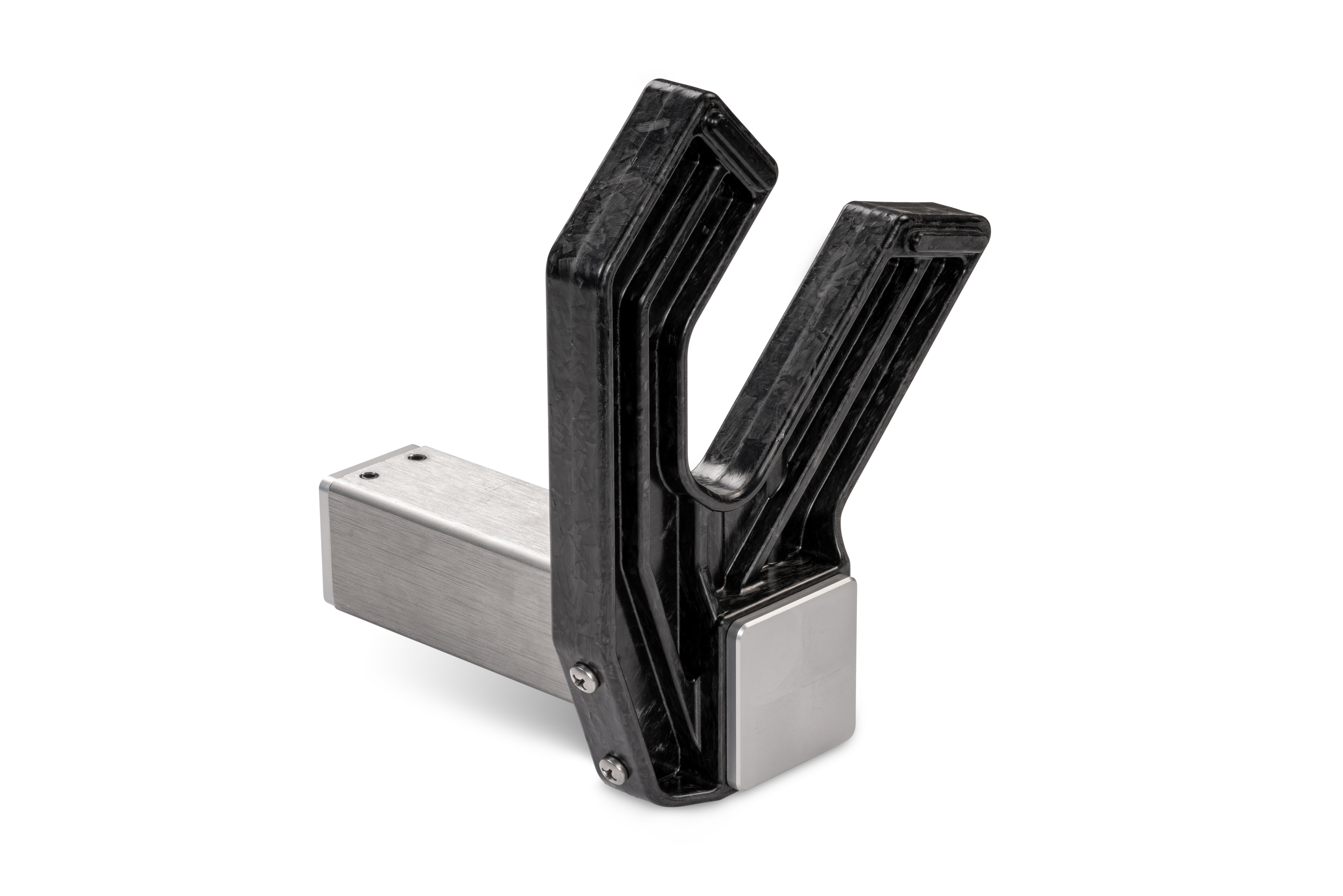 Ein typisches Beispiel hybrider Bauweise ist der Greifbackenarm – ein Komponente, welche beim CFK-Sheriff in zweifacher Ausführung zur Anwendung kommt. Nägeli Swiss AG hat das vormalig einteilige Bauteil aus massivem Gussaluminium hinsichtlich der Bauteilmasse und Performance optimiert und in ein hybrides Bauteil überführt, bestehend aus einem verschleissfesten Chromstahl-Vierkantrohr und einer leichten, aber steifen aCC-Greifbacke, welche «felgenschonend» montiert werden kann.